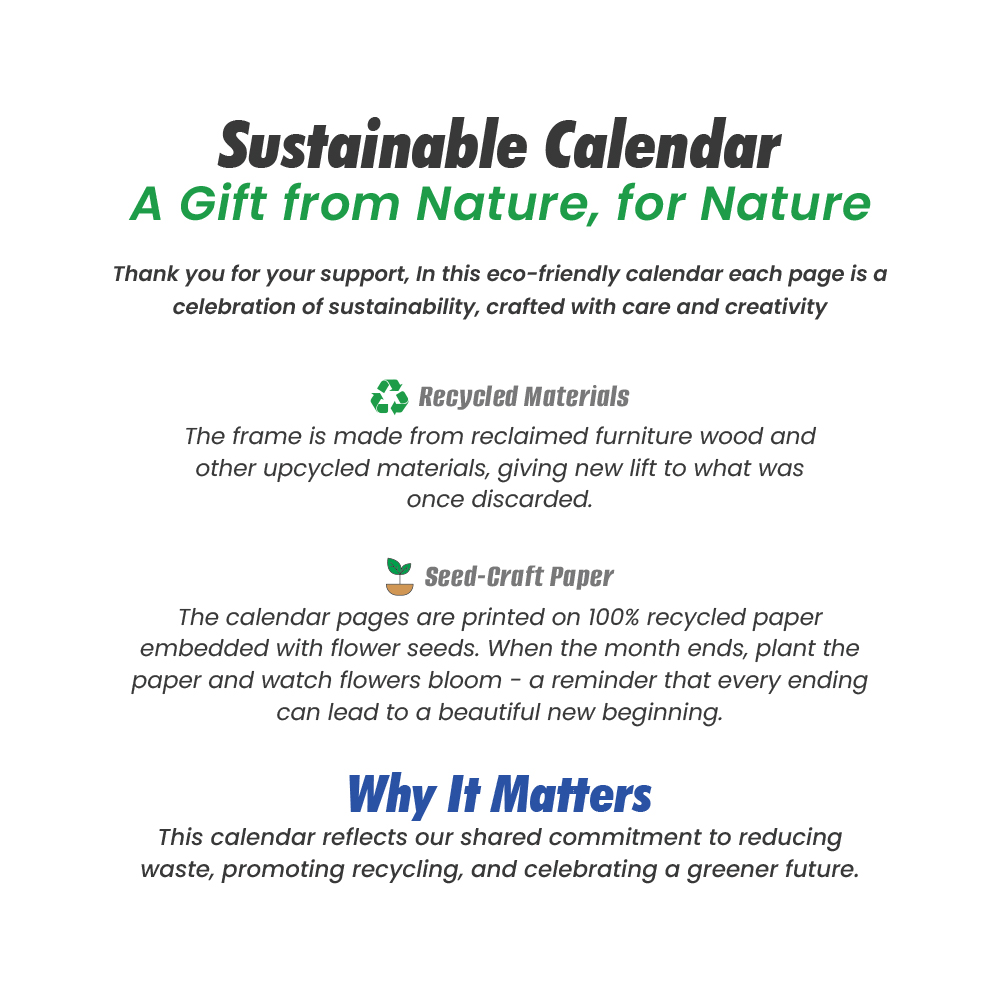Crafted using recycled and upcycled materials, the calendar frame incorporates reclaimed wood and repurposed components, transforming waste into refined design. Each page is printed on eco-friendly seed paper made from recycled fibers — once the month ends, simply plant the page and watch flowers grow. It’s a thoughtful reminder that every action can contribute to a greener future.