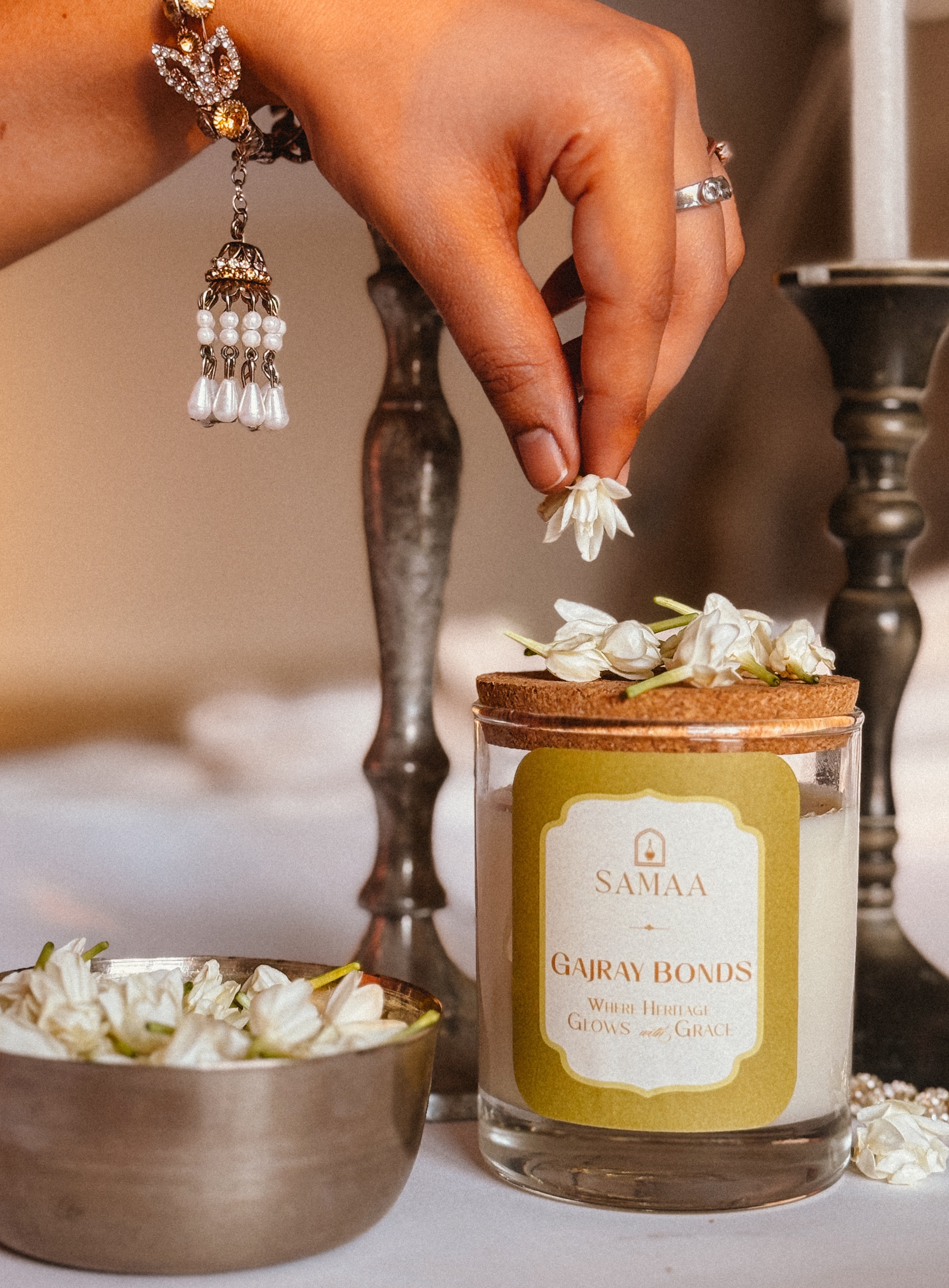 It is the memory of silk, bangles, and whispers in the corridor. A garland made of stories. Poured into a delicate pearl-toned glass jar and finished with an unbleached cotton wick, Gajray Bonds is a soy wax candle that burns clean, slow, and soft just like the traditions it draws from.